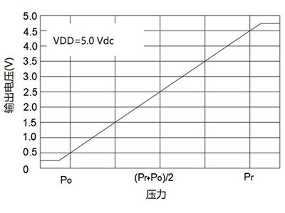 | LABAS=A×P B pansin: OUT ay ang analog output boltahe, sinusukat sa volts; P ay ang halaga ng presyon, ganap na presyon, sa kPa; Tingnan ang talahanayan sa ibaba para sa A at B. |