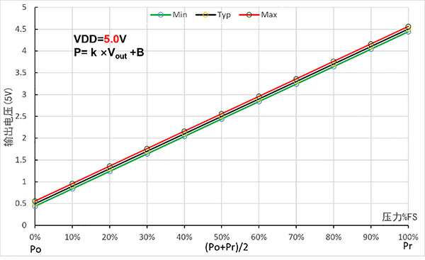 Tandaan: Ang Vout ay ang analog na output boltahe (unit: V); P ay ang halaga ng presyon (sa kPa); k. Ang B ay kumakatawan sa linear coefficient at offset, tulad ng ipinapakita sa talahanayan sa ibaba.